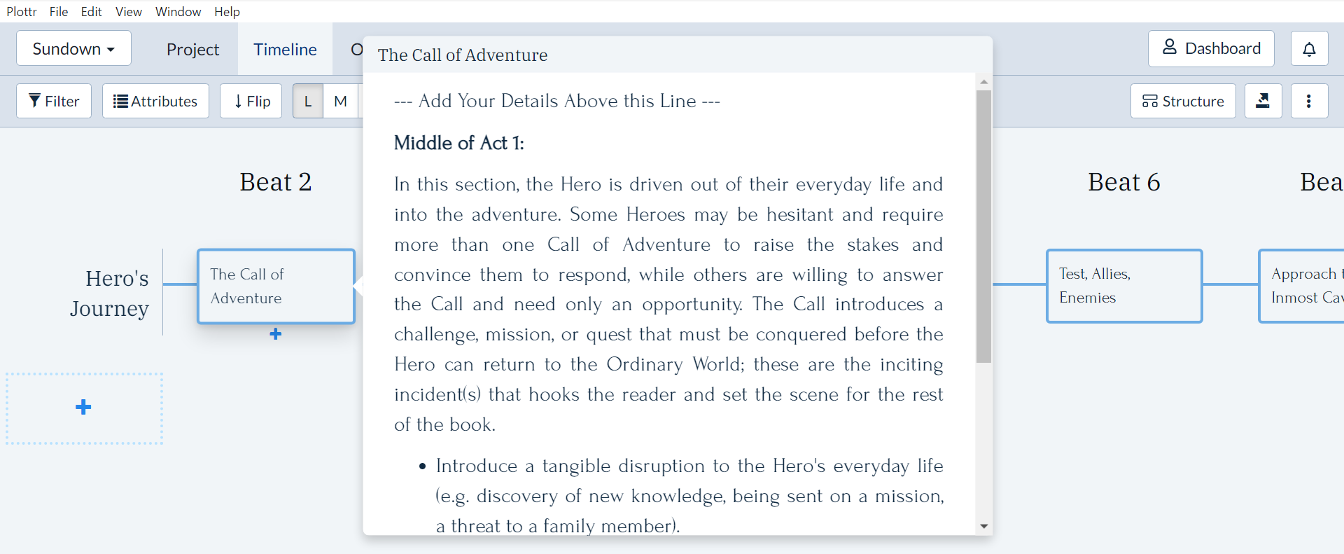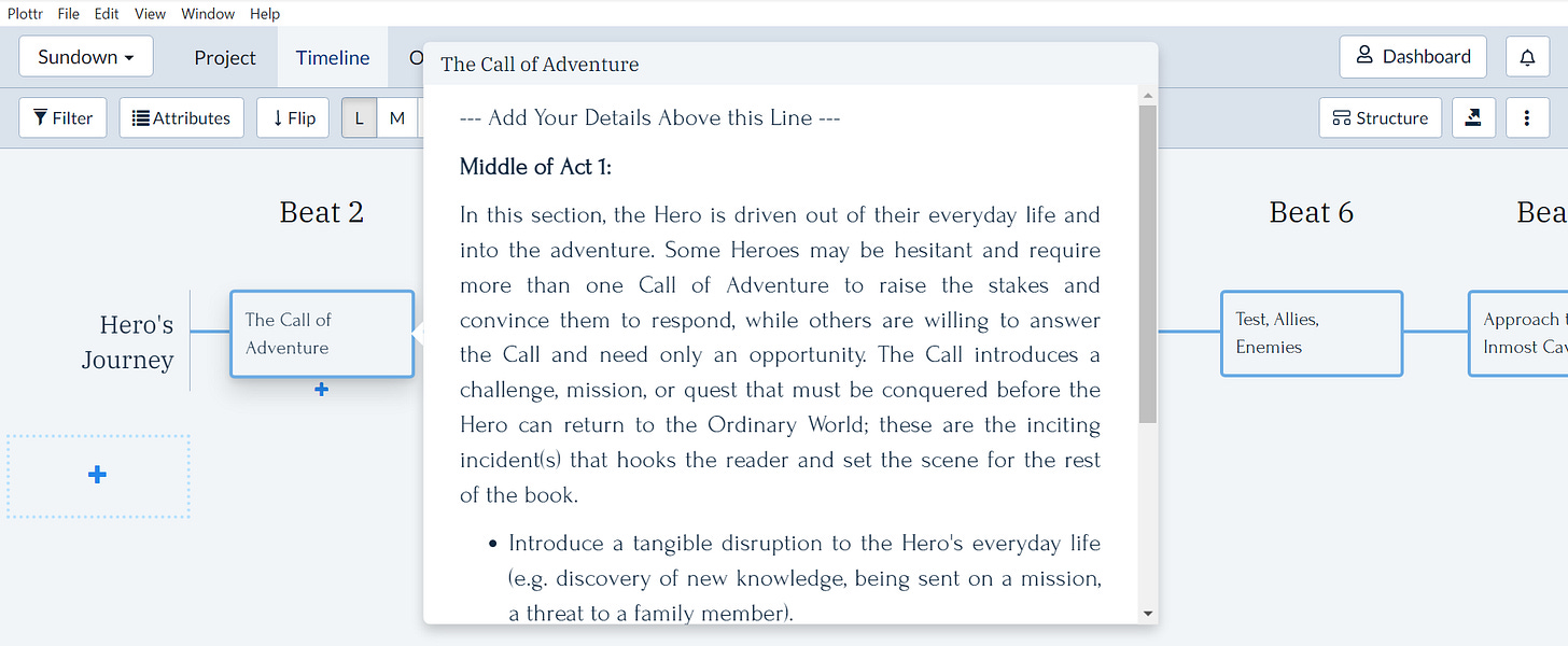 Plottr has some of that functionality as well, but I used it mostly for structure. I write all genre fiction and without any formal education in creative writing, I underestimated the importance of structure.