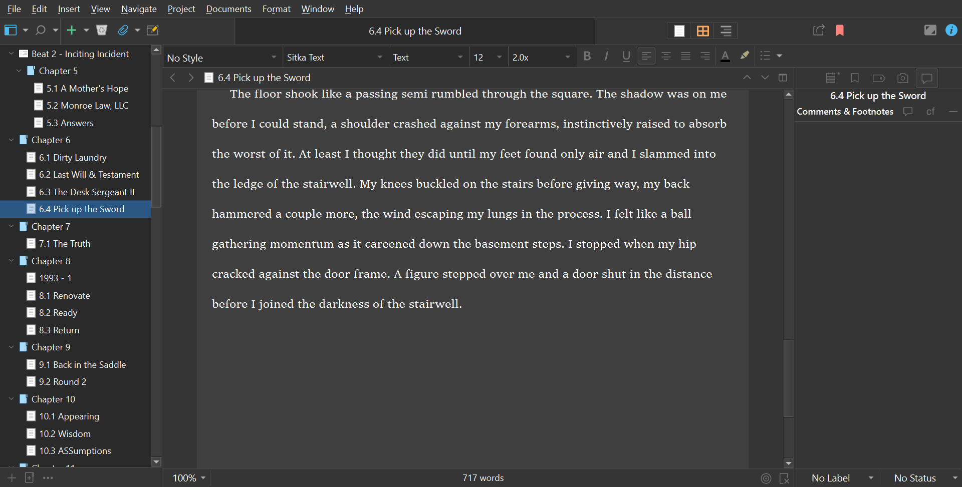 Scrivner was great for organizing content and has a ton of places to keep notes/research. You can sketch characters and upload pictures, then move them all around to organize how you see fit. AND…it low-key reminds me of WordPerfect.